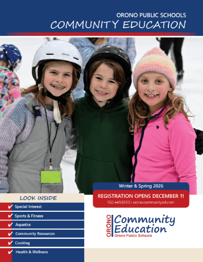 ORONO COMMUNITY EDUCATION -- Learning & enrichment opportunities for people of all ages -- Click Sign In in the upper right corner of this page. Enter your email address & password or click "Create One Now" Winter & Spring 2026 January - May 2026Science, Nature, Technology & EngineeringAquaticsCreative Art, Performing Art & MusicSports & FitnessECFE & PreschoolAdult Classesand much more!Registration opens December 11 at 8:00 AMClick here to register for Winter & Spring! FALL 2025 September - December 2025Science, Nature, Technology & EngineeringAquaticsCreative Art, Performing Art & MusicSports & FitnessECFE & PreschoolAdult Classesand much more!Click here to register for Fall! Early Learning Programs Preschool, ECFE (parent/child classes), & Clubhouse. Discovery Kids Child Care Year-round, full-day licenced child care for 6 weeks - PreK. Spartan Kids School Age Care Before and/or after school child care for Grades K - 5. Full-day care on most non-school days. Youth Enrichment (K-12) After school & non-school day classes in science & technology, art, sports & more. Adult EnrichmentFitness, wellness, creative arts, special interest, cooking, day trips. Aquatics Swim lessons, Metro Marlins swim team, aquatic fitness programs, open swim.
